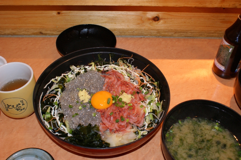 この日はしらすがあまり獲れなくて、しらすだけの丼は提供できないとのこと(たくさんの人にしらすが行き渡るように)。そこで注文したのが下の3品。