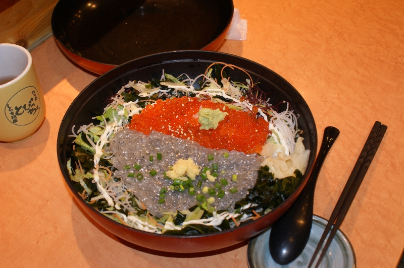丼のまわりにちりばめられているのは、大根やわかめなどのサラダ。丼との相性抜群です!!